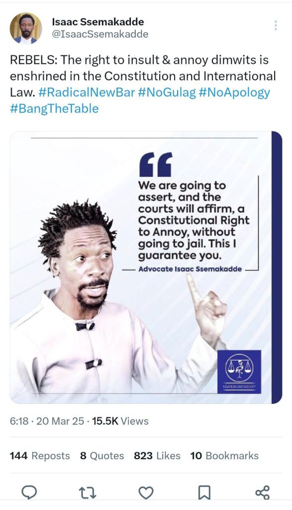 This blog is dedicated to all prisoners, present and past, of conscience, self-expression, and free speech: Male Mabirizi Kiwanuka, Ivan Samuel Sebadduka J, and Isaac K. Ssemakadde (SC), President of the Uganda Law Society, for executing a civic duty tragically confused with contempt of court.